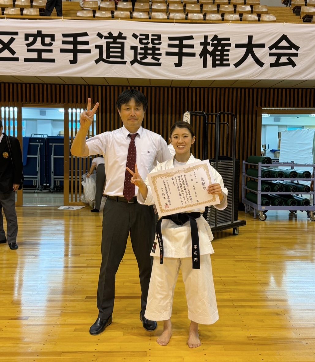藤枝市静岡県武道館で行われた東海地区空手道選手権大会において4位の成績を収めました。 2児の母でもある真名先生の素晴らしい活躍です。 写真は常心門静岡県連盟の柴川達也師範と。